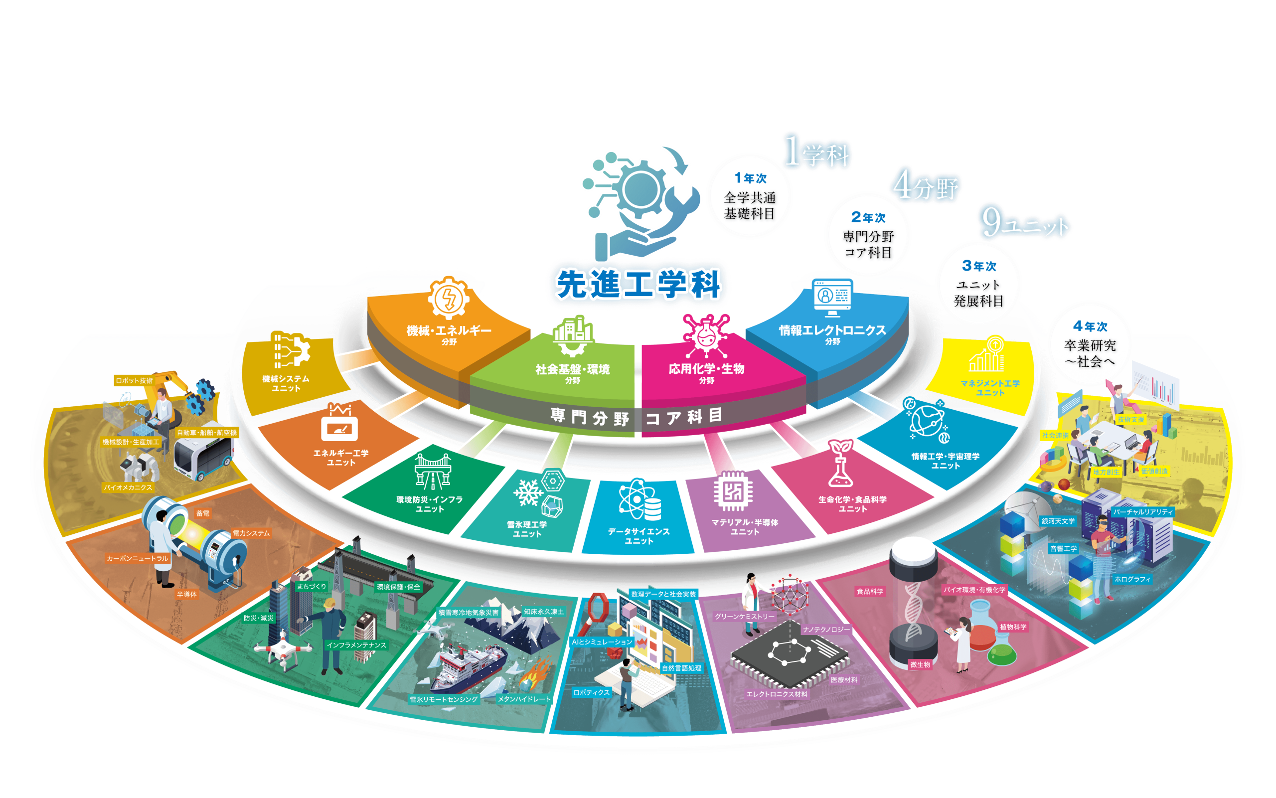 北見工業大学は日本最北の国立大学法人として、北海道東部オホーツク圏の中核都市・北見市に立地しています。周辺には、世界自然遺産に登録されている知床を始め4つの国立公園が広がり、厳しく鮮やかな四季折々の景色と豊かな自然に恵まれた地域となっております。このような環境において、北見工業大学では「自然と調和するテクノロジーの発展」をキーワードに、「人を育て、科学技術を広め、地域に輝き、未来を拓く」という理念のもと、専門分野の基盤的な技術や知識を有するだけでなく、分野横断的な学際領域や新しい分野の開拓にも柔軟に対応できる人材の養成を使命とし、地域の知の拠点としての役割を担っています。
