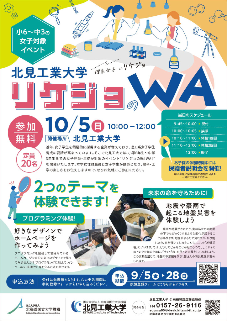 近年、女子学生を積極的に採用する企業が増えており、理工系女子学生育成の要請が高まっていることから、北見工業大学では本学教員と女子学生が講師となり、理科・工学の楽しさを知ってもらう機会として、小学6年生~中学3年生までの女子児童・生徒を対象としたイベント「リケジョのWA」を開催します。
