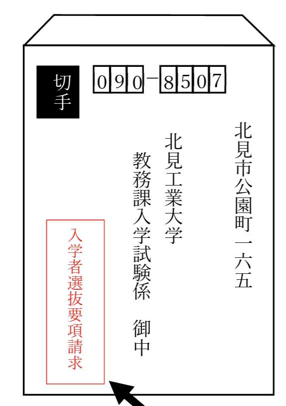 郵便で請求ください。封筒表面に「入学者選抜要項請求」又は「入学者選抜要項+大学案内請求」と朱書し、返信用封筒〔角形2号(33.2㎝×24.0㎝)に郵便番号、住所及び氏名を明記し返信用切手を貼り付けたもの〕を同封してください。
